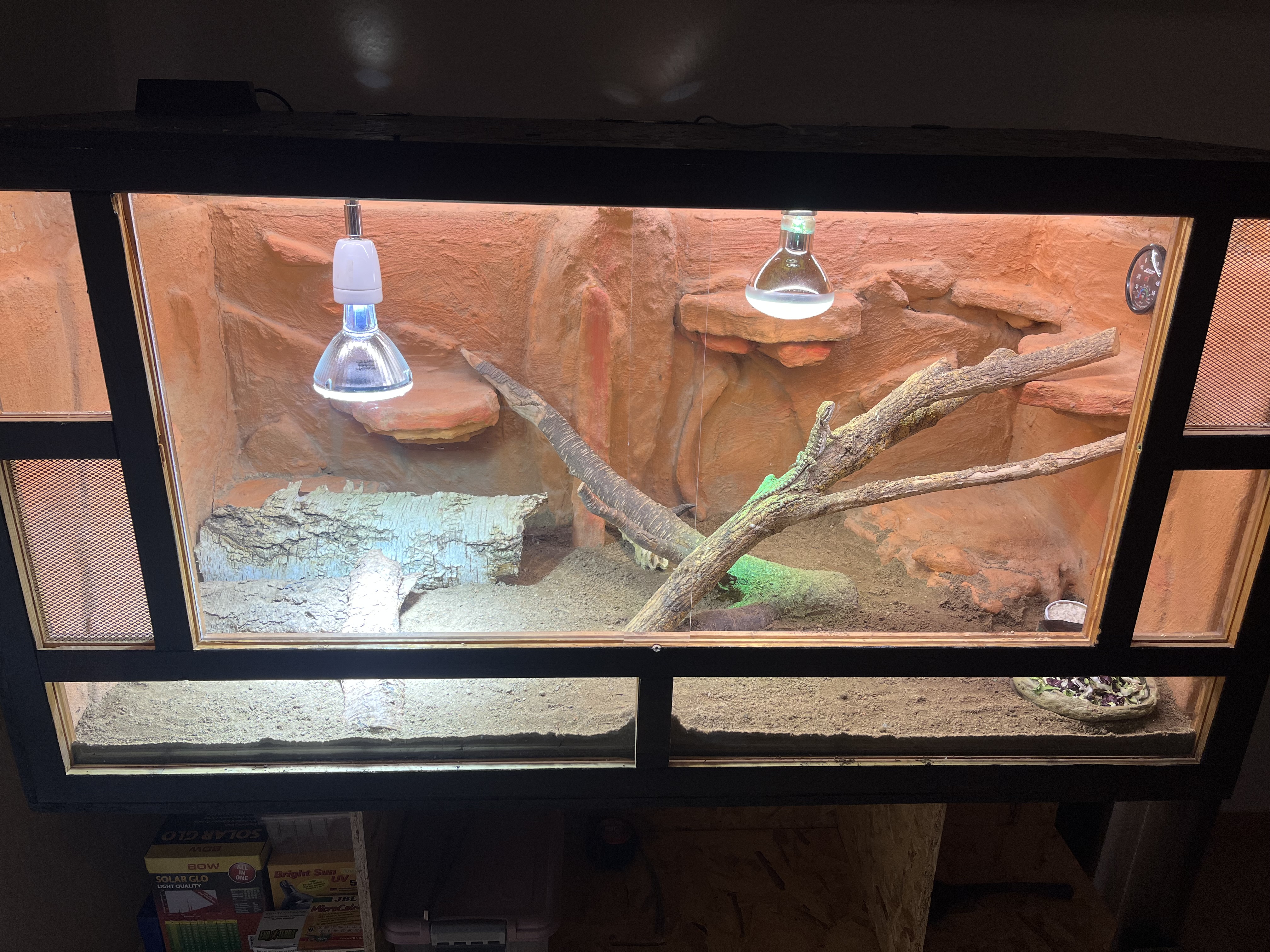 Ich habe den basking spott durch eine exo terr solar glo 80 watt getauscht dadurch ist die die Grund Temperatur nun auf 30 32 grad hoch der kühlste spot ist durch die neue Versteck Möglichkeit auch noch bei 25 grad
